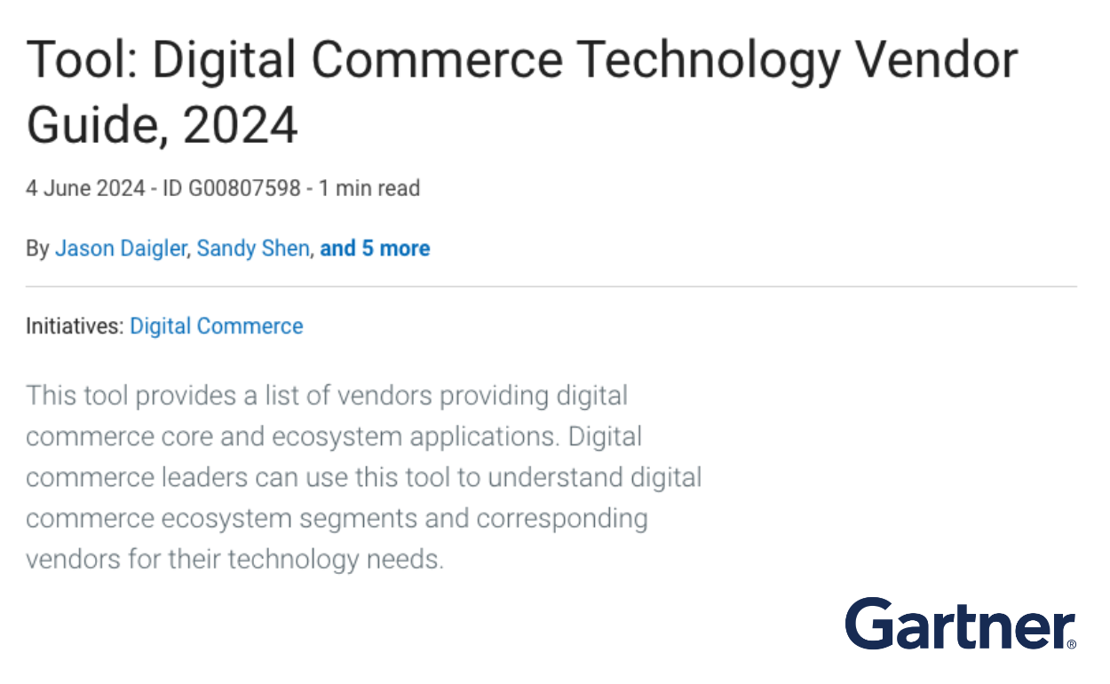 Erneut stolz über unsere Nominierung des größten Marktforschungs-Instituts Gartner zu den wichtigsten DIGITAL COMMERCE TECHNOLOGY VENDORS in 2024!
